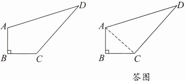 【解析】:连接AC,在直角三角形ABC中,根据勾股定理可得AC的长度为$\sqrt{AB^{2}+BC^{2}}=\sqrt{3^{2}+4^{2}} = 5m$。在三角形ACD中,因为$AC^{2}+CD^{2}=5^{2}+12^{2}=25 + 144=169$,而$DA^{2}=13^{2}=169$,所以$AC^{2}+CD^{2}=DA^{2}$,由勾股定理的逆定理可知三角形ACD是直角三角形,且$\angle ACD = 90^{\circ}$。这块空地的面积等于三角形ABC的面积与三角形ACD的面积之和,即$S=\frac{1}{2}× AB× BC+\frac{1}{2}× AC× CD=\frac{1}{2}×3×4+\frac{1}{2}×5×12 = 6 + 30=36m^{2}$。已知铺草坪每平方米需花费100元,所以铺满这块空地共需花费$36×100 = 3600$元。