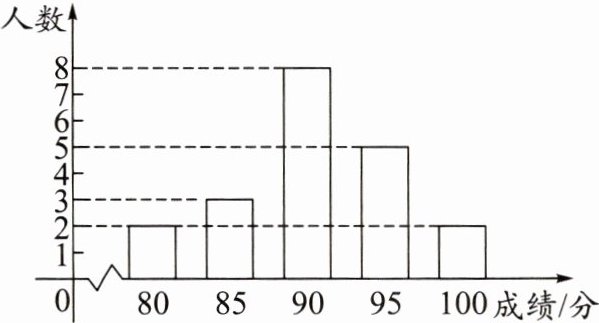 (2)根据规定,成绩大于或等于90分为优秀等级。统计图中90分、95分和100分的人数分别是8人、5人和2人,合计15人。