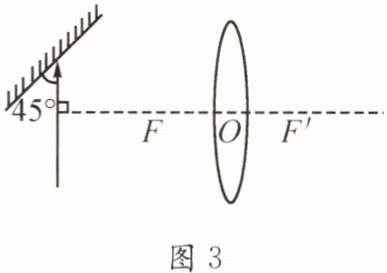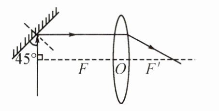 解析 由图可知,入射光线垂直于凸透镜的主光轴,同时斜射到平面镜上,与平面镜的夹角为$45^{\circ }$,则其入射角为$90^{\circ }-45^{\circ }=45^{\circ }$,反射角也为$45^{\circ }$,则反射光线与主光轴平行. 首先过入射点作出法线,然后根据反射角等于入射角作出反射光线;再根据平行于主光轴的光线经凸透镜折射后,折射光线过焦点,作出折射光线,如图所示: