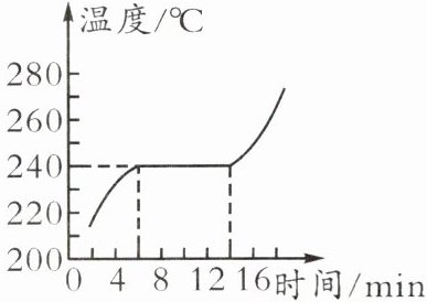 【解析】:由图象知,该物质在熔化过程中温度保持$240^{\circ}C$不变,所以该物质是晶体,熔点为$240^{\circ}C$;在第10 min时处于熔化过程中,所以是固液共存态,并且在熔化过程中吸热,温度保持不变。