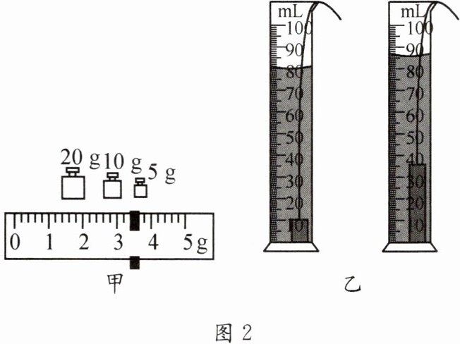 (3) 小王把一支同样的粉笔用一层保鲜膜紧密包裹好放入水中(保鲜膜的体积忽略不计),发现粉笔漂浮在水面上,于是他用水、小金属块、量筒和细线测量粉笔的体积,如图 2 乙。粉笔的密度为____