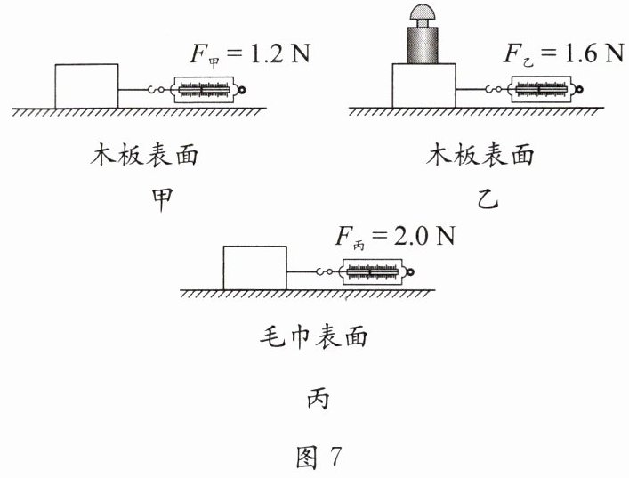 20. 某兴趣小组在探究“滑动摩擦力的大小与什么因素有关”时,用同一木块分别做了如图7所示的甲、乙、丙三次实验.