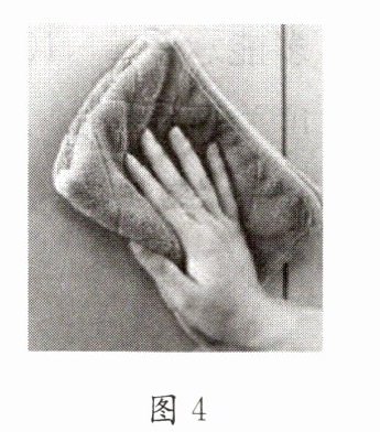16. 如图4是小明用抹布做清洁时的情景. 当小明向左擦拭桌面时,抹布受到桌面的摩擦力方向是向