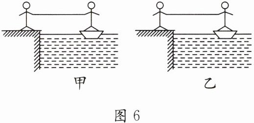 8. 在图6甲、乙中,河里停着两只完全相同的小船,两船离岸的距离相等,船上各站着一个质量相等的人,河岸上也各站着一个人,现要使两船靠岸,甲图中只有岸上一人用力$F$收绳,乙图中岸上和船上的两人都用力$F$收绳,则______