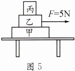 6. 如图5所示,水平桌面上有甲、乙、丙三个物块叠放在一起,现用$5N的力F$沿水平方向拉物块乙,甲、乙、丙都保持静止。下列说法错误的是(
