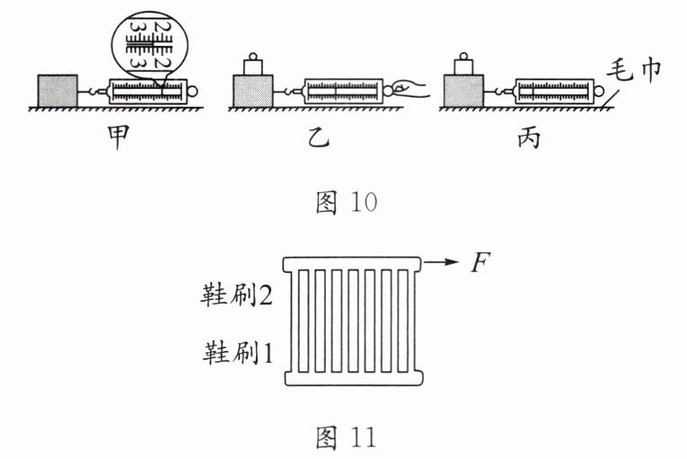 )小聪利用如图11所示生活用品探究摩擦力方向。鞋刷1固定在水平面上,向右缓慢拉动鞋刷2,下列对实验现象的描述或分析正确的是______。A. 鞋刷2的刷毛向右弯曲