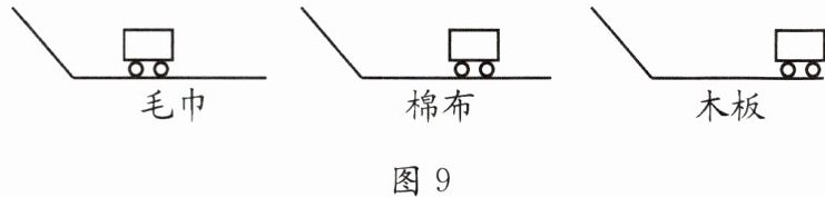 11. 在“推断物体不受力时的运动”的实验中,让木块由静止开始沿斜面滑下,木块在三种不同水平面上运动一段距离后分别停留在如图9所示的位置。