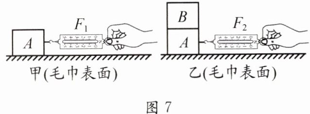 19. 如图 7 所示,在甲图中用弹簧测力计拉着物块 $ A $ 做匀速直线运动,此时弹簧测力计示数为 $ F_1 $,乙图中在物块 $ A $ 上叠放一块与之相同的物块 $ B $,用弹簧测力计拉着物块 $ A $,使物块 $ B $ 随 $ A $ 一起做匀速直线运动. 弹簧测力计示数为 $ F_2 $,则 $ F_1 : F_2 = $