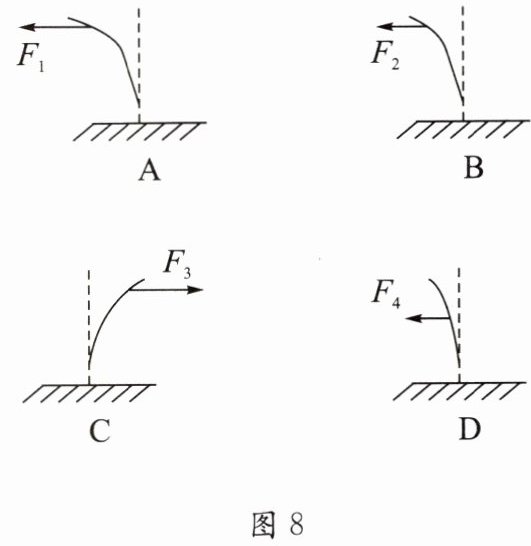 20. 某实验兴趣小组做了一个实验,来探究力的三要素对力的作用效果的影响. 如图 8 所示,让一条薄钢条的一端固定,现分别用不同的力去推它,使它发生如图 8 中 $ A、B、C、D $ 所示的形变,如果力 $ F_1 = F_3 > F_2 = F_4 $,那么,