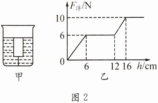3. 将一圆柱形木块用细线拴在容器底部,容器中开始没有水,往容器中逐渐加水至如图2甲所示位置.在这一过程中,木块受到的浮力随容器中水的深度的变化如图2乙所示,则由该图象得出的以下信息中,正确的是(