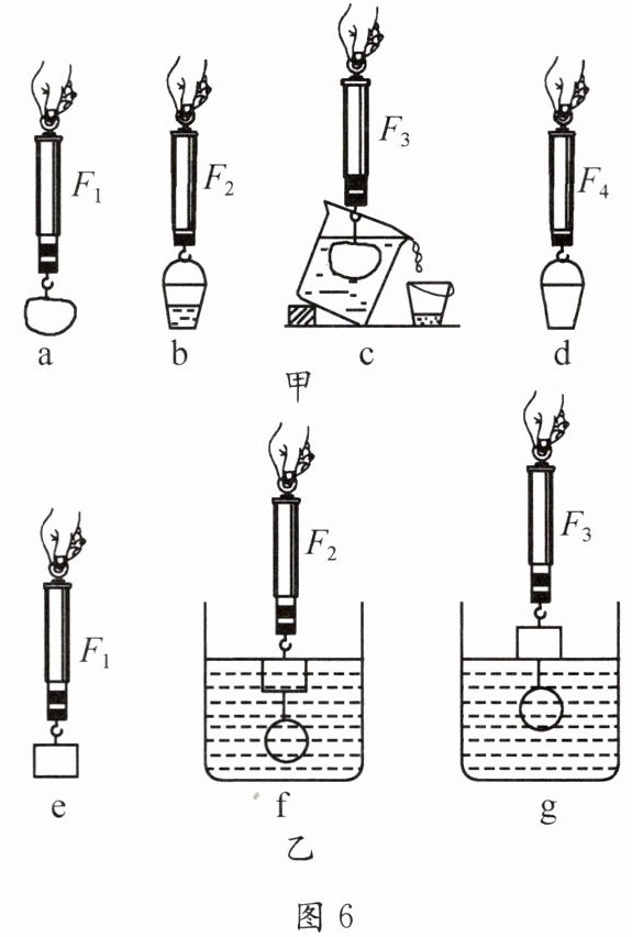 15. 小明同学在探究“浮力的大小等于什么”的实验时,所用实验器材为:弹簧测力计、密度大于水的塑料块、烧杯、小桶和水. $a$、$b$、$c$、$d$是四个步骤的示意图,其中$d$测量空桶受到的重力,四步实验中弹簧测力计的示数分别为$F_{1}$、$F_{2}$、$F_{3}$、$F_{4}$(如图6甲).