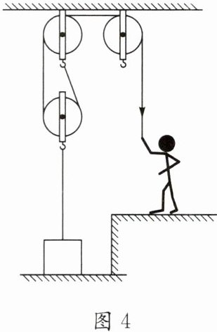 4. 如图4所示,重为800N的物体静止在水平地面上,与地面接触的面积为$1.0×10^3cm^2。$工人师傅使用滑轮组用500N的拉力匀速提升该物体,物体沿竖直方向提升了2m(不计摩擦及绳重)。求: