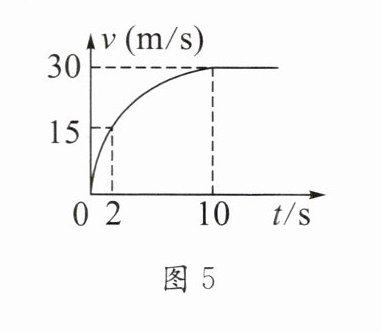 5. 某汽车出厂前的检测中,汽车保持恒定功率在水平路面做直线运动,测得其速度随时间变化的图象如图5所示,假设该汽车运动中所受阻力不变,加速至2s时,牵引力为4000N。求: