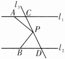 21. (9分)如图,已知直线 $ l_1 // l_2 $,直线 $ l_3 $ 和直线 $ l_1 $、$ l_2 $ 分别交于点 $ C $、$ D $,在线段 $ CD $ 上有一点 $ P $。