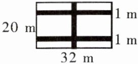 东西道路两条,每条宽 $1 \, \text{m}$,长 $32 \, \text{m}$,面积为 $2 × 32 × 1 = 64 \, \text{m}^2$。