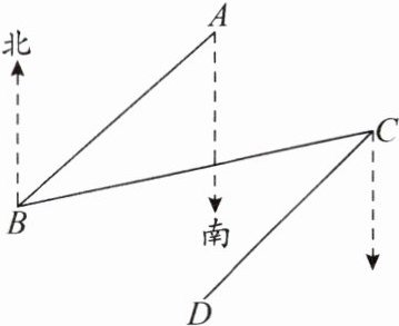 18. (7分)如图,$ B $ 处在 $ A $ 处的南偏西 $ 45^\circ $ 方向,$ C $ 处在 $ B $ 处的北偏东 $ 80^\circ $ 方向。