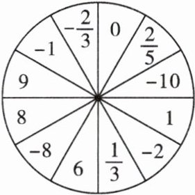 10. 如图是芳芳自己设计的自由转动的转盘,转盘被等分成$12$个扇形,上面有$12$个有理数,求转出的数是:(1) 正数的概率;(2) 负数的概率;(3) 绝对值小于$6$的概率;(4) 相反数大于或等于$8$的概率.
