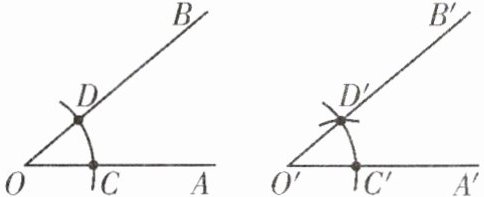 ④过点$D'画射线O'B'$, 则$\angle A'O'B'= \angle AOB$.