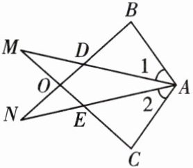 18.(南充中考)(7分)已知$\triangle ABN和\triangle ACM$位置如图所示,$AB= AC$,$AD= AE$,$\angle 1= \angle 2$。