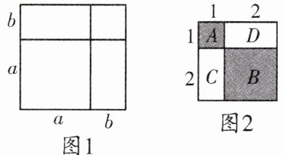 (2) 如图 2,$A$ 表示 1 个 $1 × 1$ 的正方形,即 $1× 1 × 1 = 1 ^ { 3 }$;$B$ 表示 1 个 $2 × 2$ 的正方形,$C$ 与 $D$ 恰好可以拼成 1 个 $2 × 2$ 的正方形,因此 $B$、$C$、$D$ 就可以表示 2 个 $2 × 2$ 的正方形,