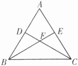 7. 如图,等腰三角形$ABC$中,$AB = AC$,点$D$,$E分别在边AB$、$AC$上,且$AD = AE$,连接$BE$、$CD$,交于点$F$。