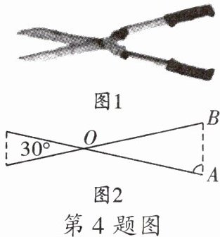 4. (江西中考)如图1是一把园林剪刀,把它抽象为图2,其中$OA= OB$.若剪刀张开的角为$30^{\circ }$,则$∠A= $