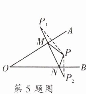 5. 如图,点P为$∠AOB$内一点,分别作出P点关于OA、OB的对称点$P_{1},P_{2}$,连接$P_{1}P_{2}$交OA于M,交OB于N,$P_{1}P_{2}= 15$,则$\triangle PMN$的周长为