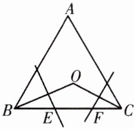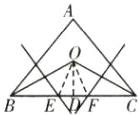 18. (7分)如图所示,在等边三角形ABC中,$∠B$、$∠C$的平分线交于点O,OB和OC的垂直平分线分别交BC于点E、F,试用你所学的知识说明$BE= EF= FC$.