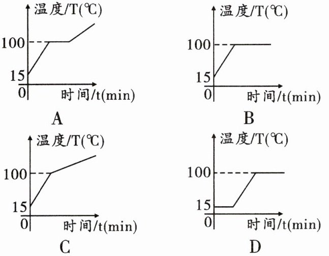 8. 在一个标准大气压下,能反映水在均匀加热过程中,水的温度T(℃)随加热时间t(min)变化的图象大致(