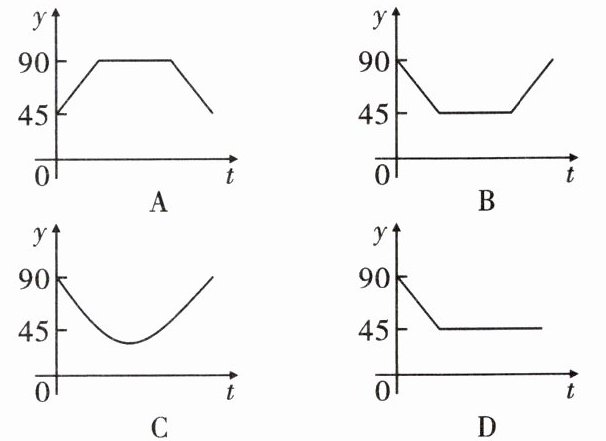11. 如图,$A$、$B$、$C$、$D为圆O$的四等分点,动点$P从圆心O$出发,沿$OC - \overset{\LARGE{\frown}}{CD}-DO$的路线做匀速运动,当点$P运动到圆心O$时立即停止,设运动时间为$t\ s$,$OP的长度为y$,则下列图象中表示$y与t$($s$)之间的函数关系最恰当的是(