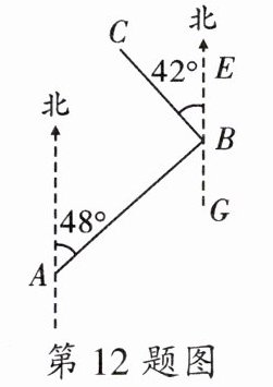 12. 如图,在 $ A $、$ B $ 两地之间要修一条笔直的公路,从 $ A $ 地测得公路走向是北偏东 $ 48 ^ { \circ } $,$ A $,$ B $ 两地同时开工,若干天后公路准确接通,若公路 $ A B $ 长 $ 8 $ 千米,另一条公路 $ B C $ 长是 $ 6 $ 千米,且 $ B C $ 的走向是北偏西 $ 42 ^ { \circ } $,则 $ A $ 地到公路 $ B C $ 的距离是(