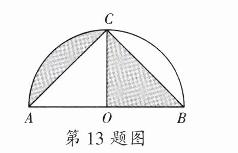 13. (重庆中考)如图,以 $ A B $ 为直径,点 $ O $ 为圆心的半圆经过点 $ C $,若 $ A C = B C = \sqrt { 2 } $,则图中阴影部分的面积是(