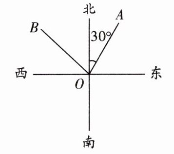 8. (乐山中考)如图,$ O A $ 是北偏东 $ 30 ^ { \circ } $ 方向的一条射线,若射线 $ O B $ 与射线 $ O A $ 垂直,则 $ O B $ 的方向角是(