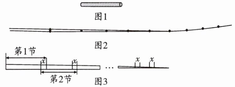 21. (江西中考)(9分)如图是一根可伸缩的鱼竿,鱼竿是用10节大小不同的空心套管连接而成.闲置时鱼竿可收缩,完全收缩后,鱼竿长度即为第1节套管的长度(如图1所示):使用时,可将鱼竿的每一节套管都完全拉伸(如图2所示).图3是这跟鱼竿所有套管都处于完全拉伸状态下的平面示意图.已知第1节套管长50 cm,第2节套管长46 cm,以此类推,每一节套管均比前一节套管少4 cm.完全拉伸时,为了使相邻两节套管连接并固定,每相邻两节套管间均有相同长度的重叠,设其长度为 $ x $ cm.