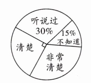6. (成都中考)第十二届全国人大四次会议审议通过的《中华人民共和国慈善法》将于今年 9 月 1 日正式实施,为了了解居民对慈善法的知晓情况,某街道办从辖区居民中随机选取了部分居民进行调查,并将调查结果绘制成如所示的扇形图. 若该辖区约有居民 9000 人,则可以估计其中对慈善法“非常清楚”的居民约有