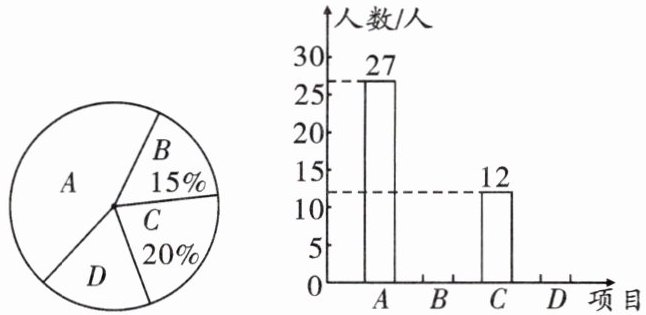 被调查的总人数是:$12÷20\% = 60$,希望参加活动B的人数为:$60×15\% = 9$,希望参加活动D的人数为:$60 - 27 - 9 - 12 = 12$,