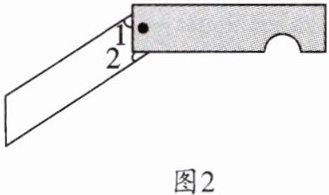 4. 如图,图1是我们常用的折叠式小刀,图2中刀柄外形是一个矩形挖去一个小半圆,其中刀片的两条边缘线可看成两条平行的线段,转动刀片时会形成如图2所示的$∠1与∠2$,则$∠1与∠2$的度数和是