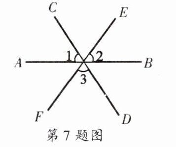 7. 如图,直线AB、CD、EF相交于O,则$∠1 + ∠2 + ∠3 = $(