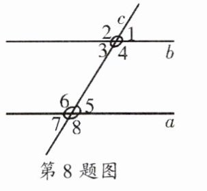 8. 如图所示,直线a、b被直线c所截,现给出下列四种条件:①$∠2 = ∠6$ ②$∠2 = ∠8$ ③$∠1 + ∠4 = 180^{\circ}$ ④$∠3 = ∠8$,其中能判断是$a // b$的条件的序号是(
