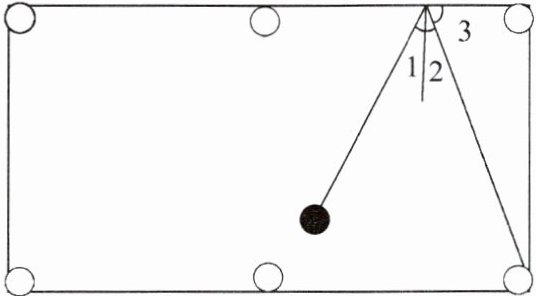 15. (6分)如图所示的是长方形台球桌面上一次击球路线,如果$∠1 = ∠2 = 30^{\circ}$,那么$∠3$等于多少度?$∠1与∠3$有什么关系?