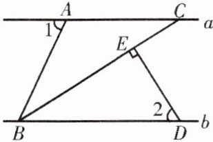 16. (6分)如图,直线$a // b$,BC平分$∠ABD$,$DE \perp BC$,若$∠1 = 70^{\circ}$,求$∠2$的度数。