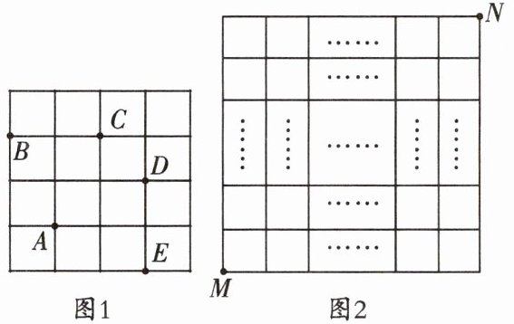 14. 在每个小正方形的边长为1的网格图形中,每个小正方形的顶点称为格点.从一个格点移动到与之相距√5的另一个格点的运动称为一次跳马变换.例如,在4×4的正方形网格图形中(如图1),从点A经过一次跳马变换可以到达点B,C,D,E等处.现有20×20的正方形网格图形(如图2),则从该正方形的顶点M经过跳马变换到达与其相对的顶点N,最少需要跳马变换的次数是(
