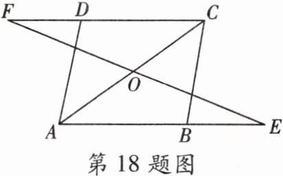 18. (7分)已知:如图,在□ABCD中,延长AB至点E,延长CD至点F,使得BE= DF。连接EF,与对角线AC交于点O。求证:OE= OF。
