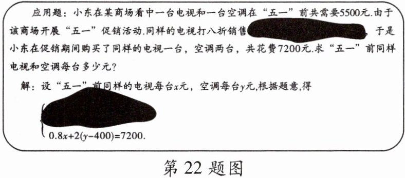 22.(9分)小明作业本中有一页被墨水污染了,已知他所列的方程组是正确的.写出题中被墨水污染的条件,并求解这道应用题.