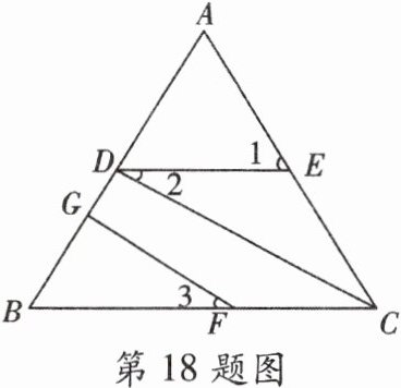 18. (9分)如图,已知$∠1= ∠ACB$,$∠2= ∠3$,试说明$∠BDC+∠DGF= 180^{\circ}$.请将下面的解答过程补充完整.
