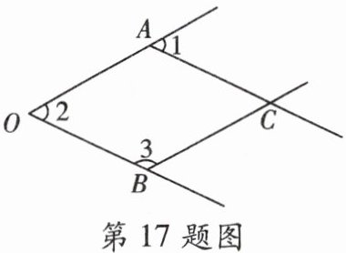 17. (7分)如图,一个由4条线段构成的“鱼”形图案,其中$∠1= 50^{\circ}$,$∠2= 50^{\circ}$,$∠3= 130^{\circ}$,找出图中的平行线,并说明理由.