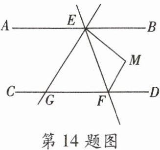 14. 如图,$AB// CD$,$EG$、$EM$、$FM分别平分∠AEF$,$∠BEF$,$∠EFD$,则图中与$∠DFM$相等的角(不含它本身)的个数为(