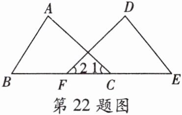 22. (12分)在数学实践课上,老师在黑板上画出如下的图形(其中点$B$、$F$、$C$、$E$在同一条直线上),并写出四个条件:①$AB= DE$,②$∠1= ∠2$.③$BF= EC$,④$∠B= ∠E$,交流中老师让同学们从这四个条件中选出三个作为题设,另一个作为结论,组成一个真命题.