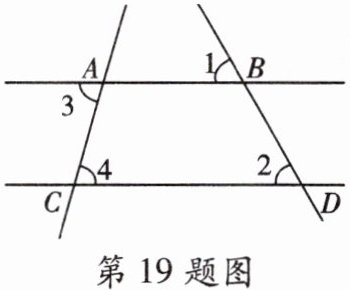 19. (10分)如图,直线$AB$,$CD分别与直线AC相交于点A$,$C$,与直线$BD相交于点B$,$D$.若$∠1= ∠2$,$∠3= 75^{\circ}$,求$∠4$的度数.