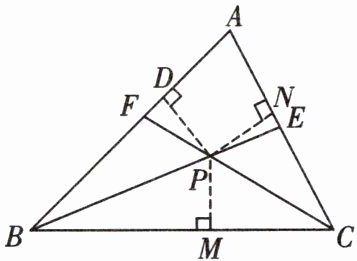 【证明】如图,过点 P 作 PD⊥AB、PM⊥BC、PN⊥AC 垂足分别为 D、M、N,